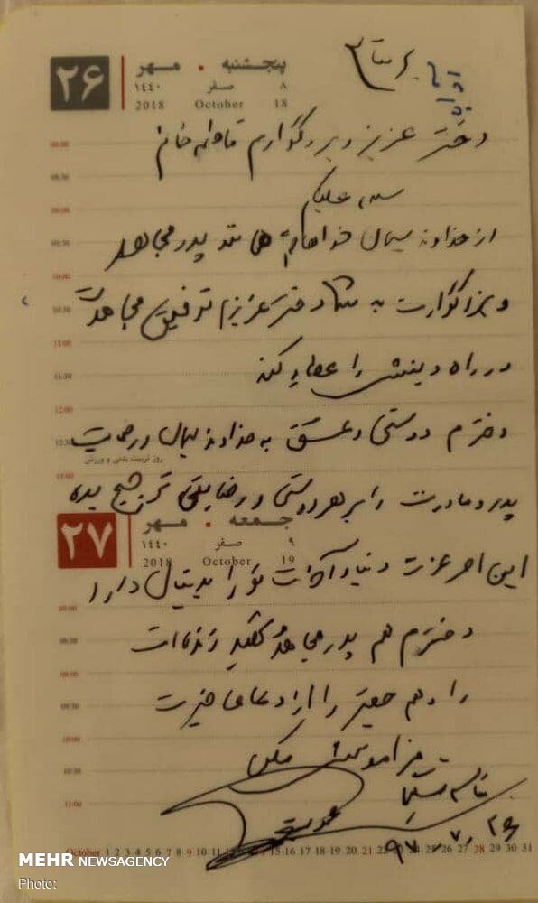 نامه شهیدقاسم سلیمانی به دختر سردار نوعیاقدم