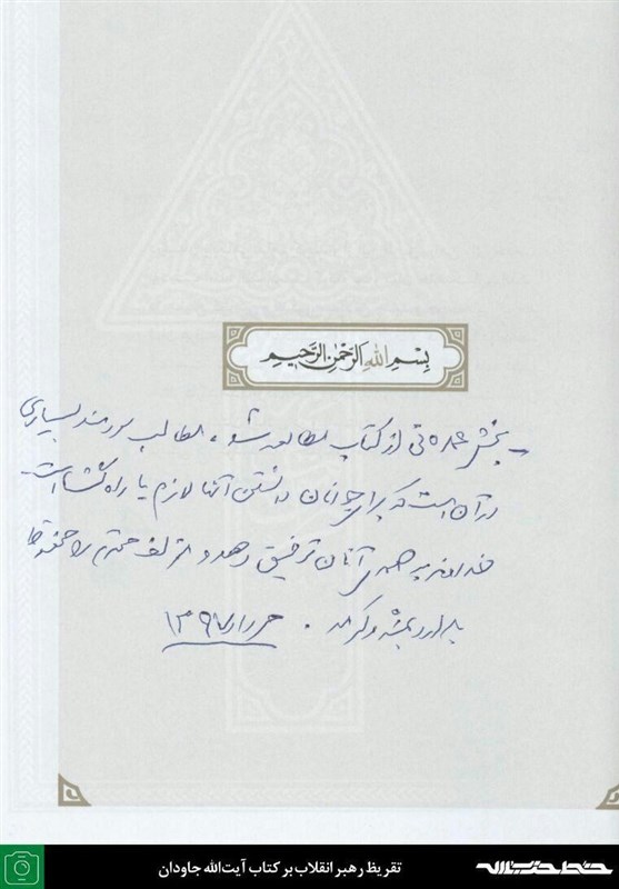 رهبر انقلاب نیز در مردادماه امســال، این کتاب را مطالعه کرده و در تقریظی کوتاه بر آن، مطالب آن را ســودمند و برای جوانان لازم یا راهگشا دانستهاند. متن تقریظ ایشــان بدین شرح است: «بســم الله الرحمــن الرحیــم. بخش عمدهای از کتاب مطالعه شــد، مطالب سودمند بسیاری در آن هست که برای جوانان دانســتن آنها لازم یا راهگشــا اســت. خداوند به همه آنــان توفیق دهد و مؤلف محتــرم را محفوظ بدارد بمنّه و کرمه. مرداد 1397»