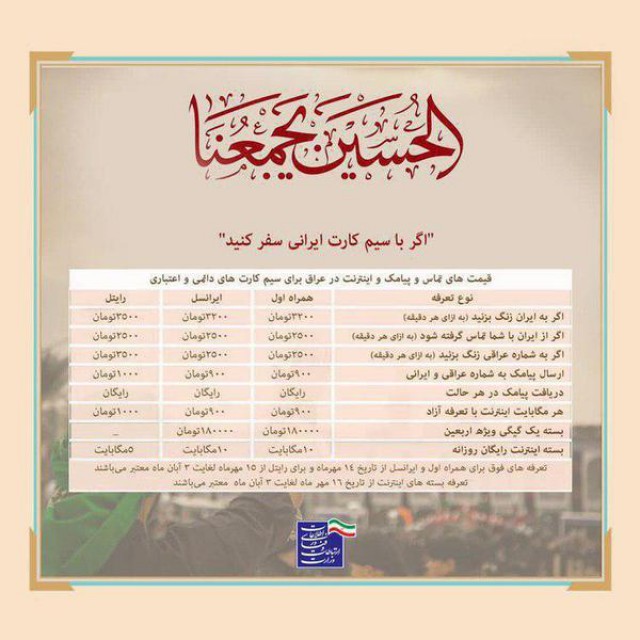 عقیق:وزارت ارتباطات در صفحه رسمی اینستاگرام خود نرخ مکالمه و اینترنت تلفن همراه ویژه زائران اربعین که از سیم کارت ایرانی استفاده می‌کنند را اعلام کرد.