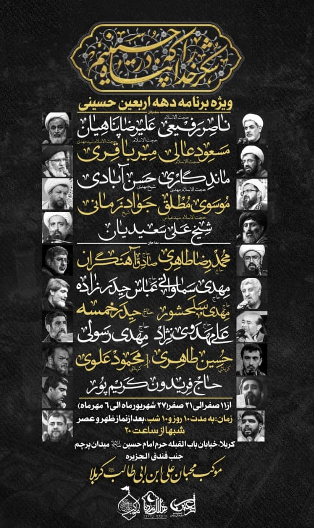 عقیق:مراسم عزاداری دهه اربعین حسینی موکب محبان علی ابن ابیطالب (ع) از شب گذشته شنبه ٢٧ شهریورماه مصادف با یازدهم ماه صفر به مدت ١٠ شب در کربلای معلی با حضور منبریها و مداحان سرشناس آغاز شد.