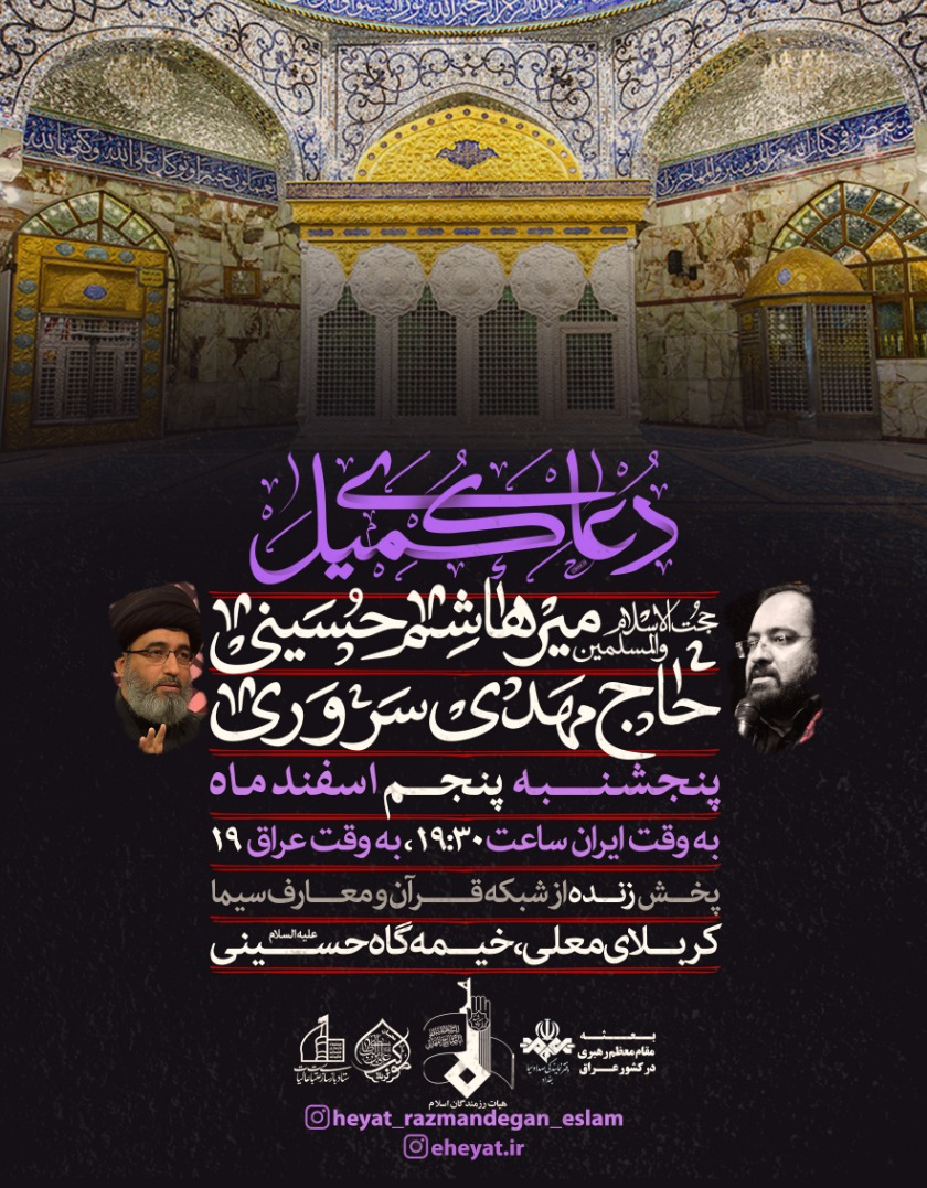 مراسم هفتگی قرائت دعای کمیل این هفته با سخنرانی حجت الاسلام میرهاشم حسینی و قرائت دعا توسط مهدی سروری در کربلای معلی برگزار می‌شود.