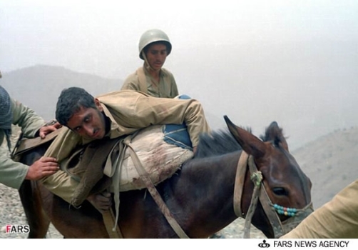 این عکس مربوط به عملیات بیت المقدس 6 است که در اواخر اردیبهشت ماه 67 در ارتفاعات شیخ محمد که مشرف به شهر ماووت بود انجام شد. در تصویر پیکر دو رزمنده شهید لشگرده سیدالشهداء(ع) دیده میشود که روی مرکب بسته شده است. شاید ساعتها طول کشید که این ابدان مطهر تا پشت جبهه رسید. این دو رزمنده که مرکب مسافران بهشت را هدایت میکنند چه حالی داشتند. اگر من بودم پشت سرشون یک دل سیر گریه کرده بودم و میخوندم: