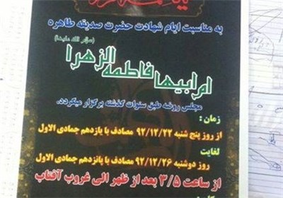 عقیق: به مناسبت ایام شهادت حضرت صدیقه طاهره فاطمه الزهرا (س) مراسم سخنرانی و روضه از روز پنجشنبه 22 اسفندماه 92 لغایت روز دوشنبه 26 اسفند ماه 92 از ساعت 15:30 تا اذان مغرب و عشا در حسینیه بیت حجت الاسلام و المسلمین سید مهدی طباطبایی برگزار میشود.