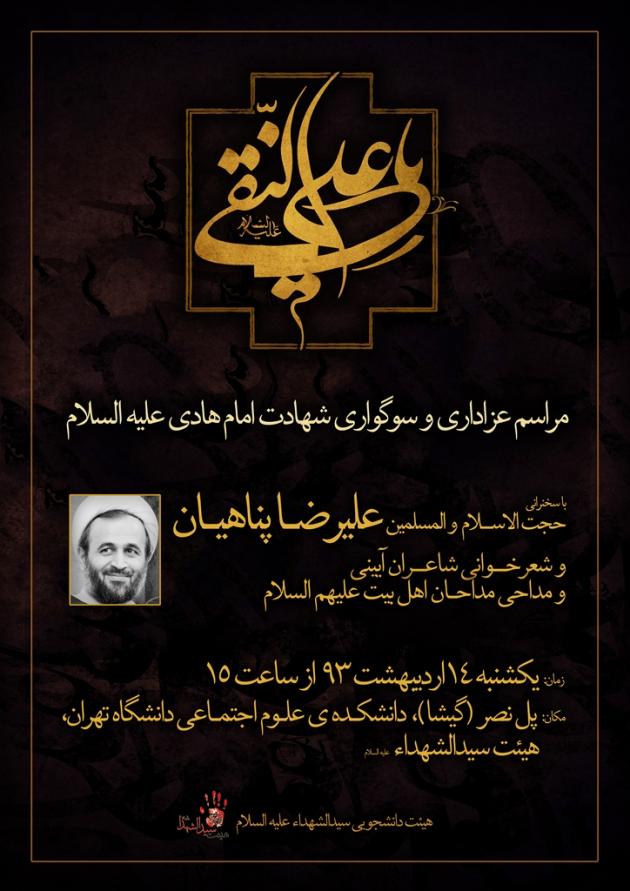 مراسم عزاداری امام هادی (ع) با سخنرانی حجت الاسلام پناهیان و مداحی ذاکرین اهل البیت برگزار می گردد.