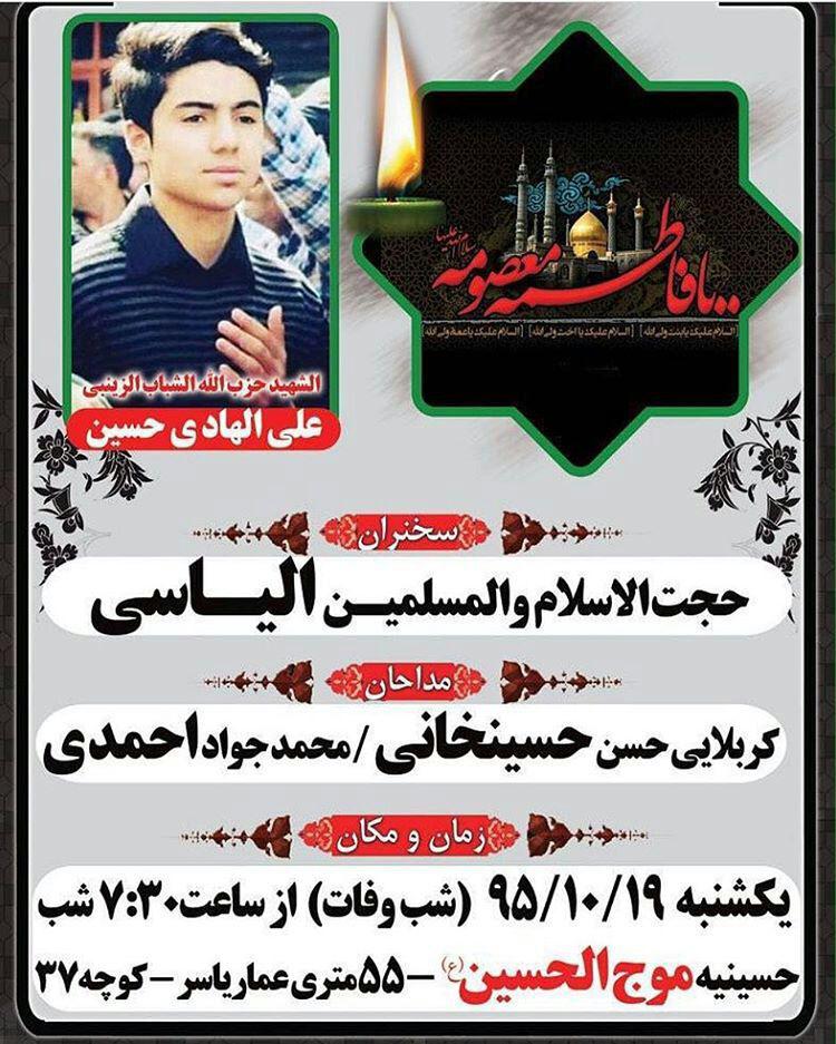 ▪️هیئت عزاداری حضرت معصومه «س» سخنران : حجت الاسلام حجتی مداح : سید مهدی میرداماد ساعت : ۱۲ آدرس : بلوار ۱۵ خرداد، خ سعدی، انتهای خیابان، سمت راست