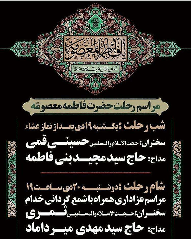 ▪️حرم مطهر حضرت معصومه «س» سخنران : سید حسین حسینی قمی مداح : سید مجید بنی فاطمه ساعت : ۱۸ آدرس : شبستان امام خمینی (ره)