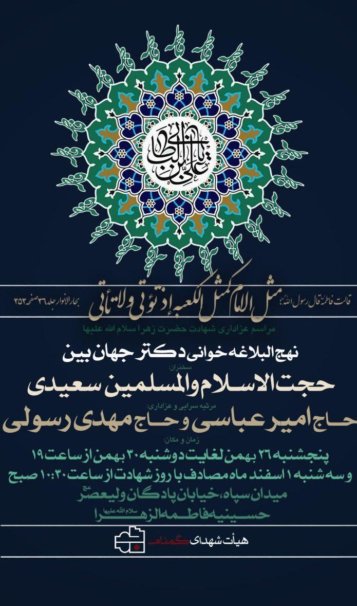 این برنامه به مدت 5 شب از 26 تا 30 بهمنماه هر شب از ساعت 19 در حسینیۀ فاطمة الزهراء (س) واقع در میدان سپاه، خیابان پادگان ولیّعصر(عج) برگزار میشود.